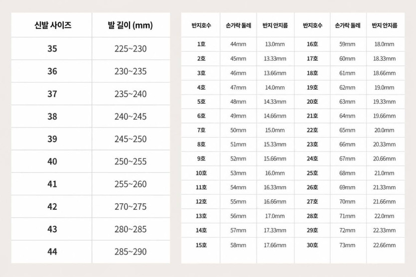 35(225~230),36(230~235),37(235~240),38(240~245),39(245~250),40(250~255),41(260~265),42(265~270),43(275~280),44(285~290)